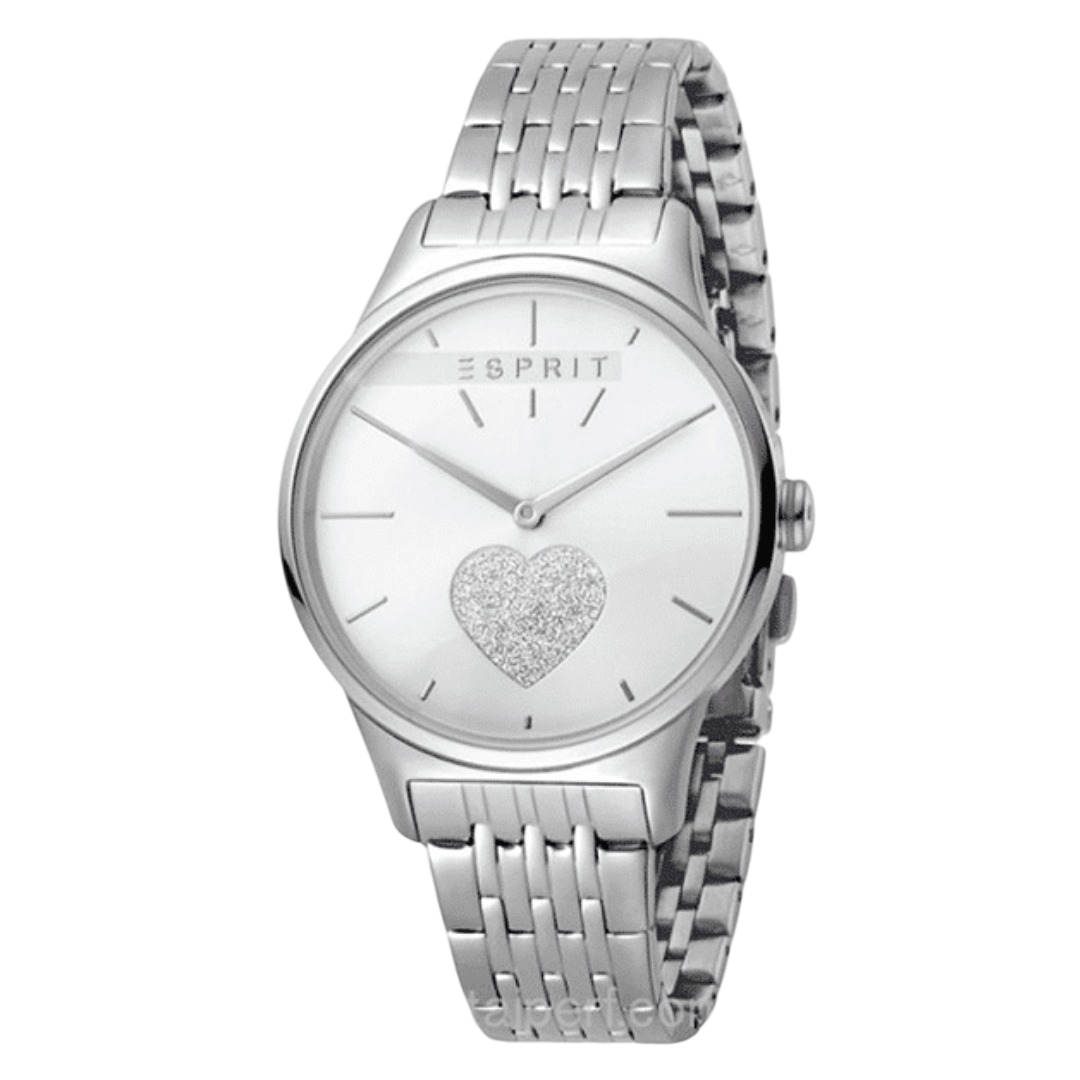 The Esprit Women’s Love Watch – Model ES1L026M0225 combines modern design with a hint of glamour. It features a 34mm stainless steel case that houses a silver glitter dial, adding a subtle shine to your wrist. The watch operates on a quartz movement, ensuring accurate timekeeping. The stainless steel bracelet is both durable and comfortable, secured with a folding clasp for ease of use. Protected by a mineral crystal, the watch is resistant to scratches, maintaining its clarity over time. With a water resistance of up to 5 ATM (50 meters), it is suitable for everyday wear, including exposure to splashes and brief immersion in water. This timepiece is perfect for women seeking a blend of sophistication and sparkle.