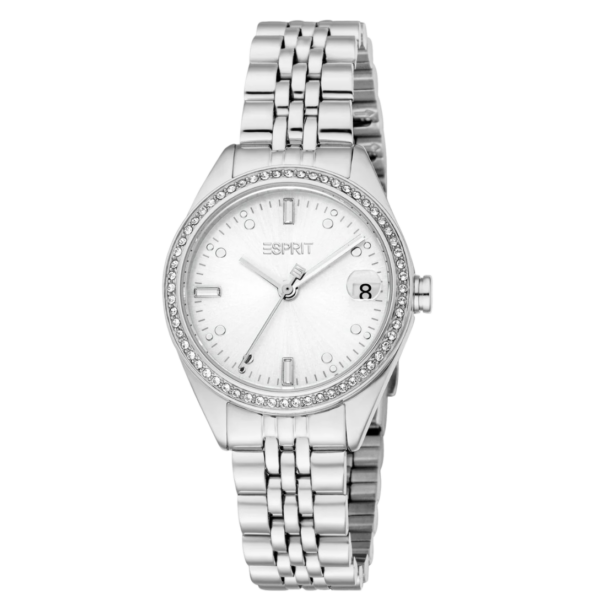 The Esprit Women’s Melody Watch – Model ES1L428M0015 combines contemporary aesthetics with functionality. It features a 30mm stainless steel case that houses a silver dial adorned with minimalist hour markers, providing a clean and sophisticated look. The stainless steel bracelet complements the overall design, ensuring durability and comfort. Powered by a reliable quartz movement and protected by a mineral crystal, this watch is built to withstand daily wear. With a water resistance of 30 meters, it is suitable for everyday activities, including hand washing.