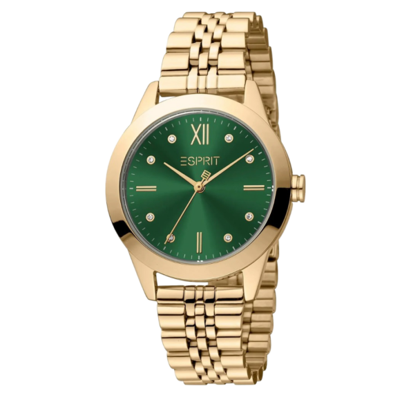 The Esprit Women’s Willow Watch – Model ES1L317M0075 showcases a sleek design with a 34mm gold-toned stainless steel case and bracelet. The dark green dial offers a clear analog display, complemented by gold-toned hands and hour markers, enhancing its sophisticated look. Powered by a reliable quartz movement, this watch ensures accurate timekeeping. The mineral crystal protects the dial from scratches, maintaining its pristine appearance. With a water resistance of up to 5 ATM (50 meters), it is suitable for everyday wear, including exposure to splashes and brief immersion in water. The combination of its modern design and functional features makes this watch a versatile accessory for any woman’s collection.