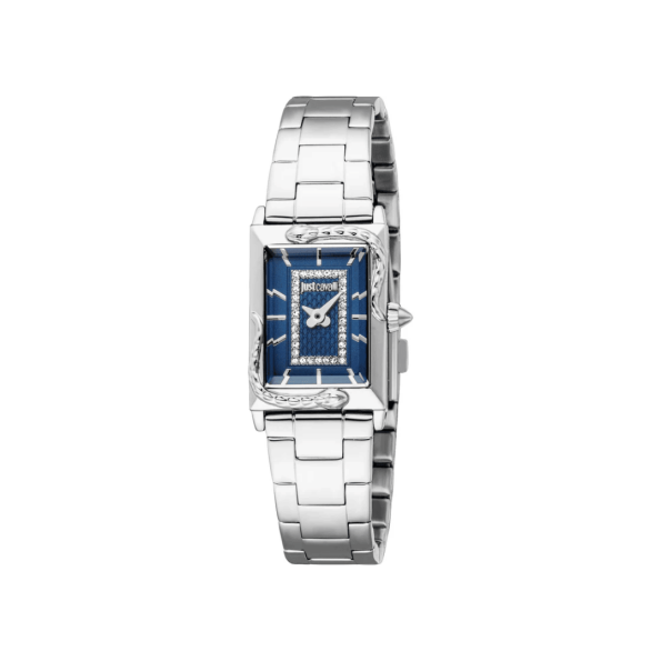The Just Cavalli Animalier Dolcezza Snake JC1L364M0055 is a stylish women’s dress watch that merges bold design with fashion-forward elegance. Featuring a silver-grey rectangular stainless steel case, the 20 mm-wide frame houses a captivating night blue dial, all protected under mineral crystal glass. Powered by a Seiko VJ20 quartz movement, the watch presents a classic two-hand display. The stainless steel bracelet is fastened with a folding deployant clasp with push-button, offering a secure and refined fit. Lightweight (about 61 g) and subtly splash-resistant, it’s the perfect accessory for both urban settings and sophisticated events.