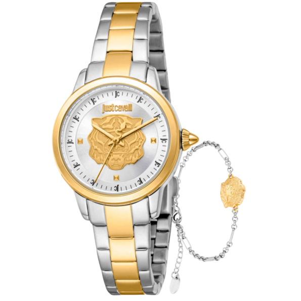 A sophisticated women’s watch set featuring a two-tone stainless steel case and bracelet, complemented by a silver dial with the iconic Just Cavalli animalier motif. This set includes a matching bracelet, offering a blend of modern design and luxury.