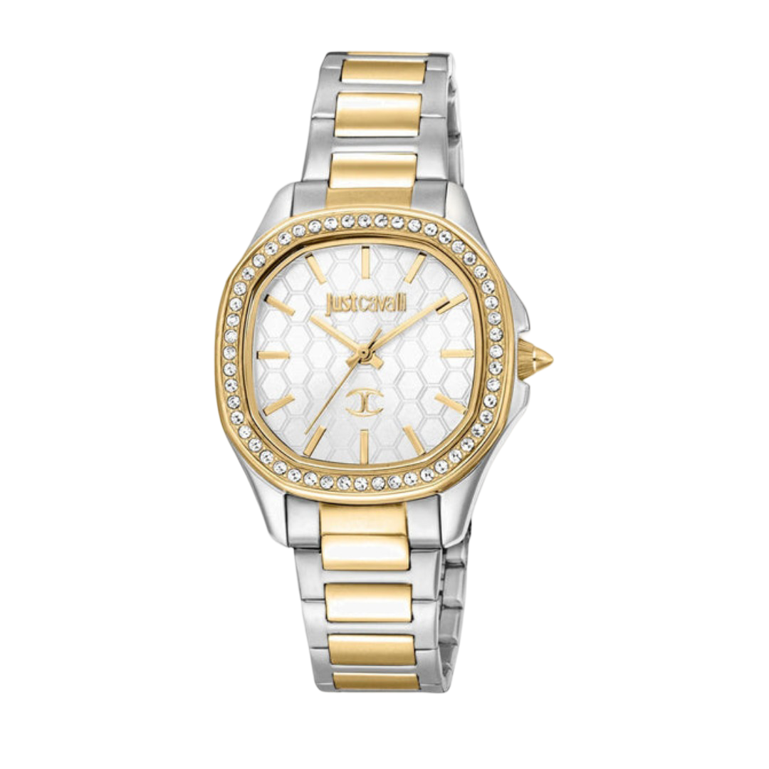 The Just Cavalli Women’s Glam Chic Quadro Watch – Model JC1L263M0085 exemplifies contemporary style with its sleek design. The 33mm stainless steel case showcases a harmonious blend of silver and gold tones, complemented by a silver-grey dial adorned with the Just Cavalli logo. The stainless steel bracelet continues the two-tone theme, offering a polished look that suits both casual and formal attire. Powered by a reliable quartz movement, this watch ensures precise timekeeping. The mineral crystal safeguards the dial from scratches, while the 5 ATM water resistance provides protection against everyday splashes. Elevate your accessory collection with this elegant and functional timepiece.