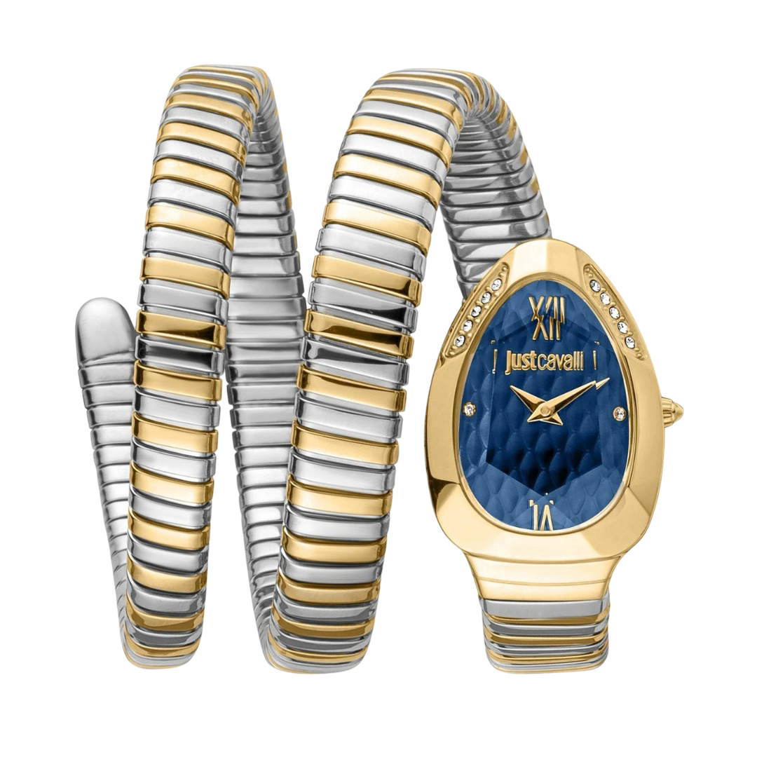 The Just Cavalli Women’s Glam Evo 9 Watch – Model JC1L224M0075 exemplifies modern luxury with its distinctive design. The gold-tone case frames a dark blue oval dial, creating a striking contrast that enhances its visual appeal. The two-tone silver and gold stainless steel bracelet is designed in a wrap-around style, offering a unique and fashionable look that wraps elegantly around the wrist. Powered by a reliable quartz movement, this watch ensures precise timekeeping. The mineral crystal protects the dial from scratches, while the 3 ATM water resistance offers protection against everyday splashes. Elevate your accessory collection with this exquisite timepiece that embodies both style and functionality.