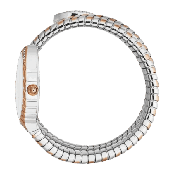 The Just Cavalli Women’s Two-Tone Watch – Model JC1L323M0065 showcases the brand’s dedication to blending modern aesthetics with timeless elegance. The 22 x 32 mm stainless steel case features a harmonious combination of silver and rose gold tones, housing a sleek silver dial protected by a scratch-resistant mineral crystal. The matching two-tone stainless steel bracelet ensures durability and comfort, secured with a bangle clasp. Powered by a precise quartz movement, this watch offers reliable timekeeping. With a water resistance of up to 3 ATM (30 meters), it is suitable for everyday wear, including exposure to splashes and rain.