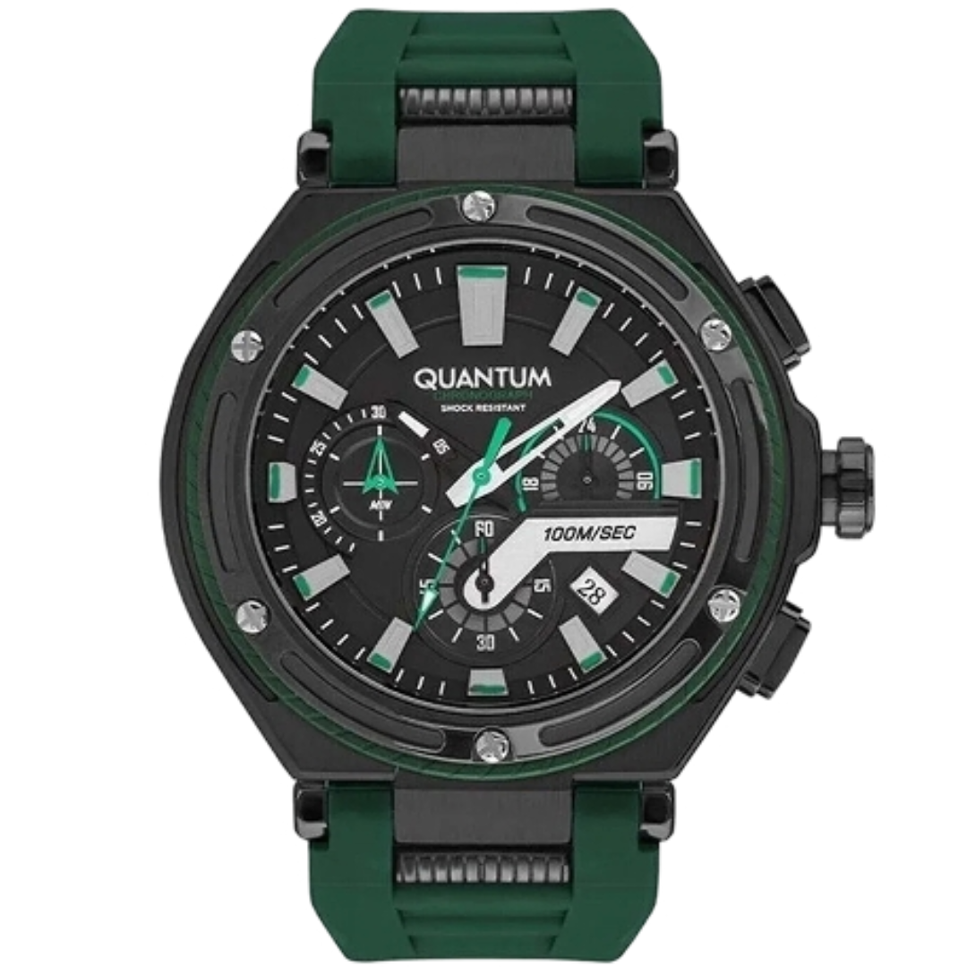 The Quantum HNG1010.656 combines bold design with functionality, featuring a black dial, chronograph display, and durable green silicone strap, suitable for both casual and adventurous wear.