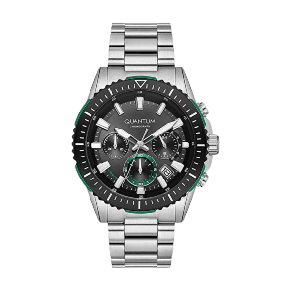 The Quantum Emerald Chronograph is a striking timepiece designed for men who appreciate precision and bold aesthetics. Featuring a deep dark green dial with detailed chronograph subdials, this watch stands out with its refined yet sporty appeal.