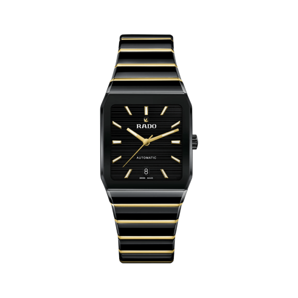 The Rado Anatom Automatic (reference R10200152) is an elegant testament to seamless design and technical mastery. Featuring a distinctive cylindrical metallized sapphire crystal with bevelled edges that flow effortlessly into a bracelet crafted from black high-tech ceramic and yellow gold-tone PVD-coated stainless steel links, the design merges case and bracelet into one unified form. Beneath this sculptural crystal lies a black lacquered dial with a unique pattern of irregular horizontal lines, accented by yellow gold-toned hands and indexes filled with white Super-LumiNova®, a moving anchor at 12 o’clock, and a discreet date window at 6 o’clock. Through a sapphire caseback, the automatic Rado Caliber R766 movement is visible—boasting 21 jewels, a Nivachron™ hairspring, precise regulation, and an impressive 72-hour power reserve.