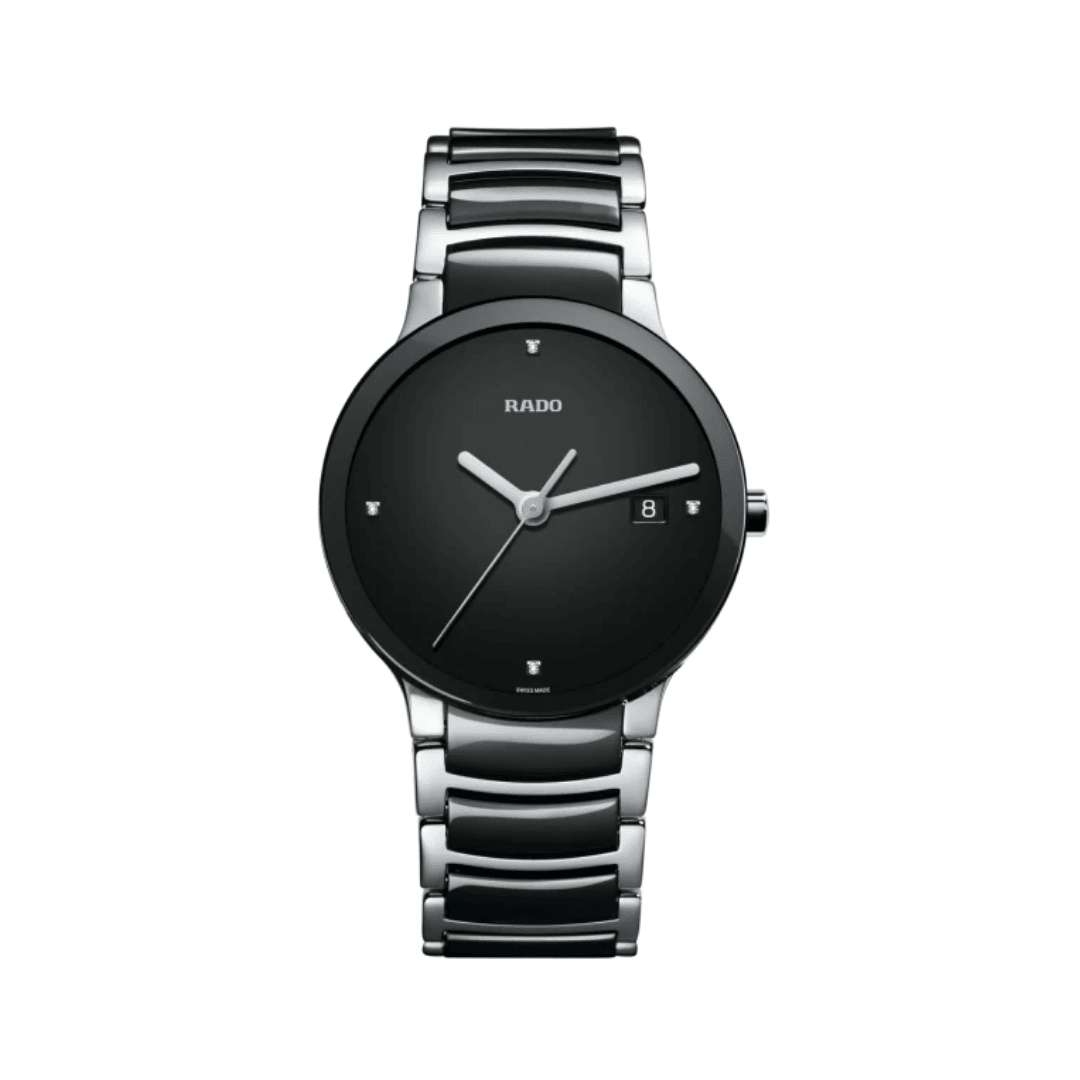 The Rado Centrix Diamonds R30934712 is a refined and elegant timepiece from Rado’s signature Centrix collection. Crafted with a sleek stainless steel and black ceramic bracelet, it features a 38 mm round case with a scratch-resistant sapphire crystal and a polished black dial. Lightweight yet luxurious, the dial is punctuated by four diamond markers and includes a discreet date window at 3 o’clock—adding a subtle sparkle. Powered by a reliable quartz movement, this watch is designed for daily wear and elevated style.