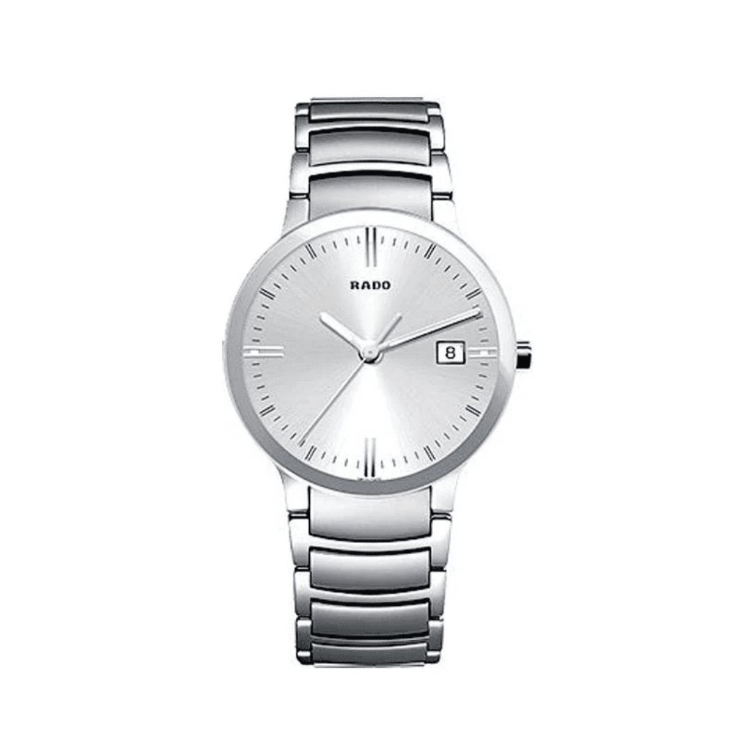 The Rado Centrix R30927103 is a sleek and refined timepiece combining contemporary design with Swiss precision. With its polished 38 mm stainless steel case and matching bracelet, this watch presents a sophisticated silhouette. The minimalist silver dial highlights luminous silver-tone hands and index markers, encased under scratch-resistant sapphire crystal. Its dependable quartz movement (Calibre 115) powers central hours, minutes, seconds, and a date display at 3 o’clock. Designed for everyday elegance and comfort, it boasts Rado’s hallmark lightweight construction and elegant lines.