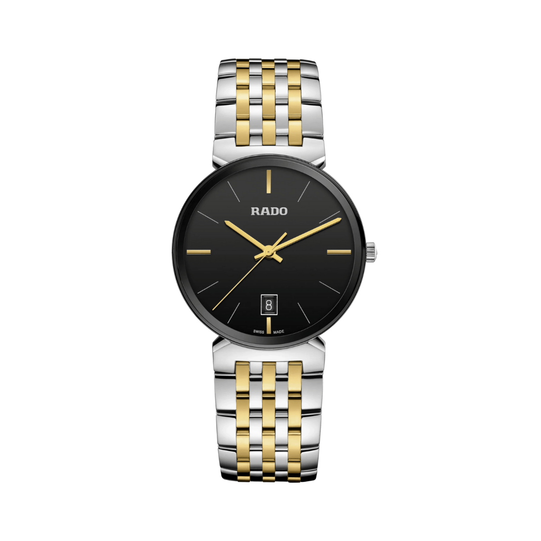 The Rado Florence Classic R48912153 is an elegant unisex timepiece that embodies Swiss craftsmanship and timeless design. Its 38mm round case is constructed from stainless steel with yellow gold PVD coating, offering a luxurious appearance. The black dial features stick indexes and a date window at 3 o’clock, adding a touch of sophistication. Rhodium-plated hands glide above these markers, all protected by a scratch-resistant sapphire crystal. Powered by a reliable Swiss quartz movement (R073 calibre), this watch combines style and practicality. The two-tone stainless steel bracelet with yellow gold PVD accents complements the case, providing a harmonious and sophisticated look. With a water resistance of 50 meters, it’s suitable for everyday wear. This model comes with a 5-year warranty, ensuring long-term reliability.