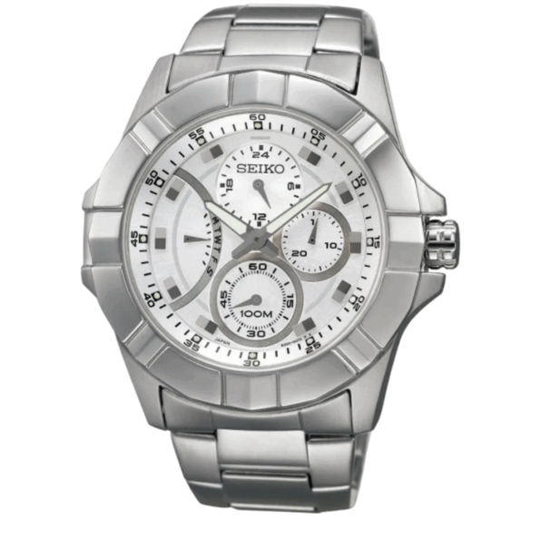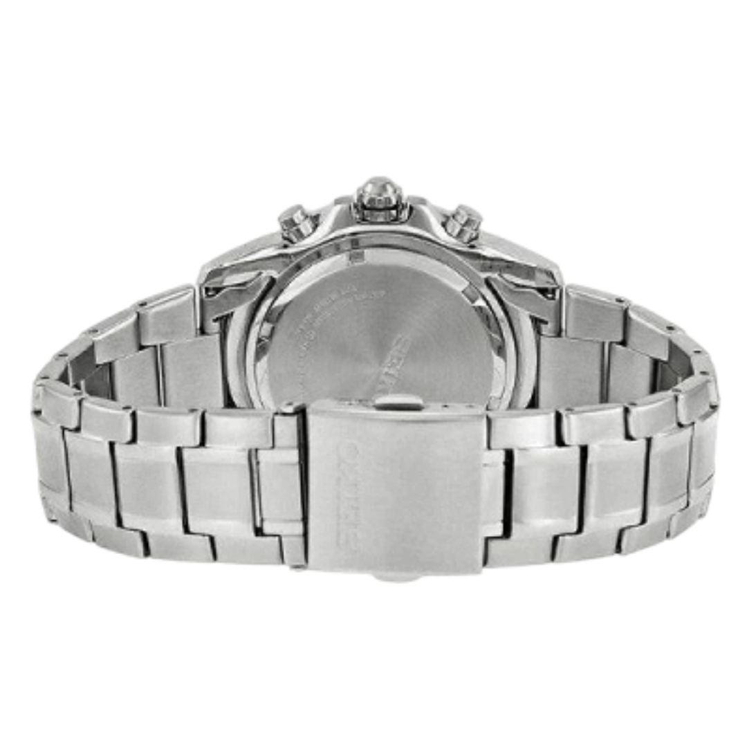 Bold and functional, the SRL065P1 features a striking black dial, chronograph subdials, and a durable stainless steel bracelet for everyday elegance.