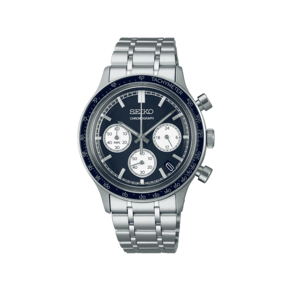 A sporty yet refined Seiko chronograph watch with a blue dial, tachymeter bezel, and 100m water resistance.