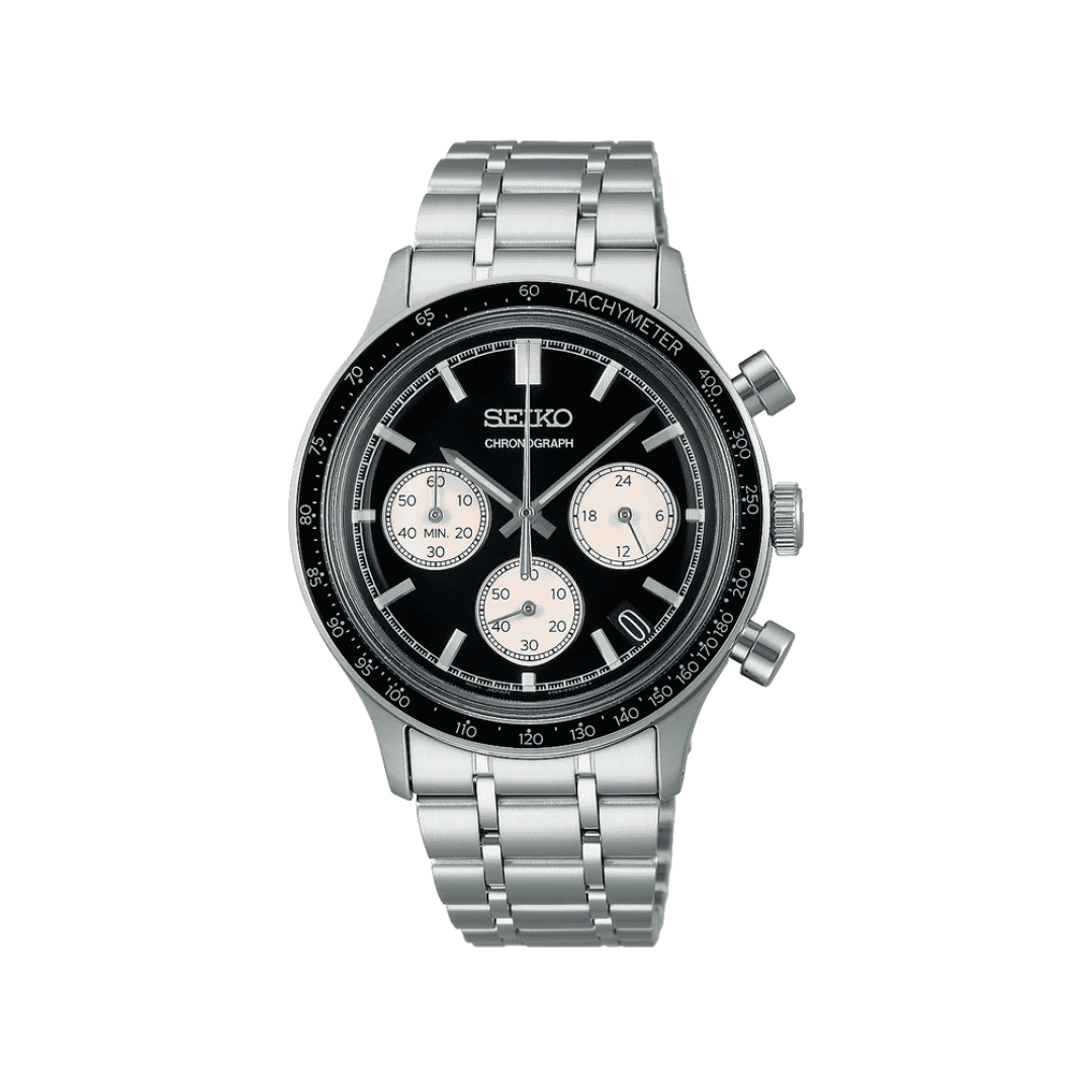 A sleek Seiko chronograph with a black dial, tachymeter bezel, and stainless steel build, offering both style and performance.