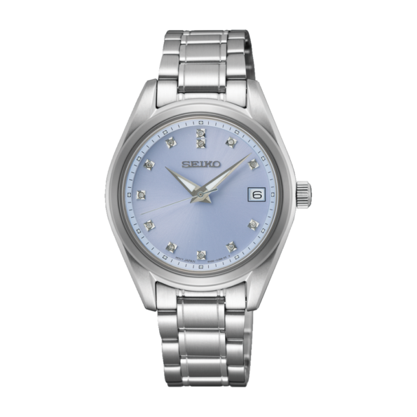 The Seiko Classic Quartz Watch – Model SUR581P1 combines timeless elegance with reliable functionality. It features a 32mm stainless steel case, a light blue dial adorned with diamond hour markers, and a date display at 3 o’clock. Powered by Seiko’s precise quartz movement, this timepiece is complemented by a stainless steel bracelet, making it suitable for both formal and casual occasions.