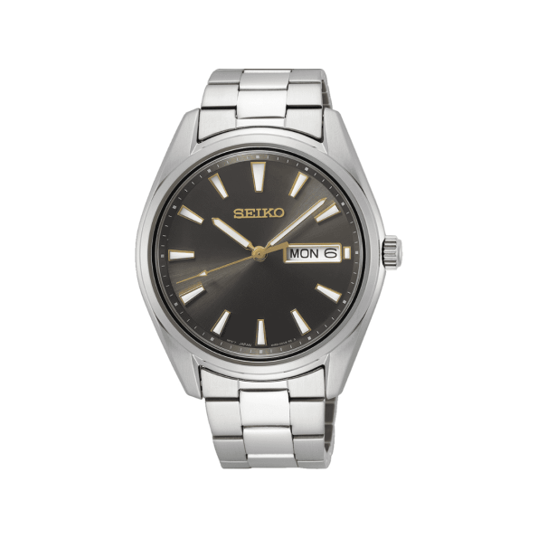 The Seiko SUR343P1 is a refined everyday watch that blends classic elegance with modern durability. Its stainless-steel case and bracelet are paired with a sunray dark-gray dial featuring gold-tone accents and LumiBrite hands for readability in low light. Powered by a reliable quartz movement with a day-date display at 3 o’clock, this timepiece offers exceptional accuracy and ease of use. A scratch-resistant sapphire crystal and 100 m water resistance make it practical for daily wear while maintaining a sleek, understated style.