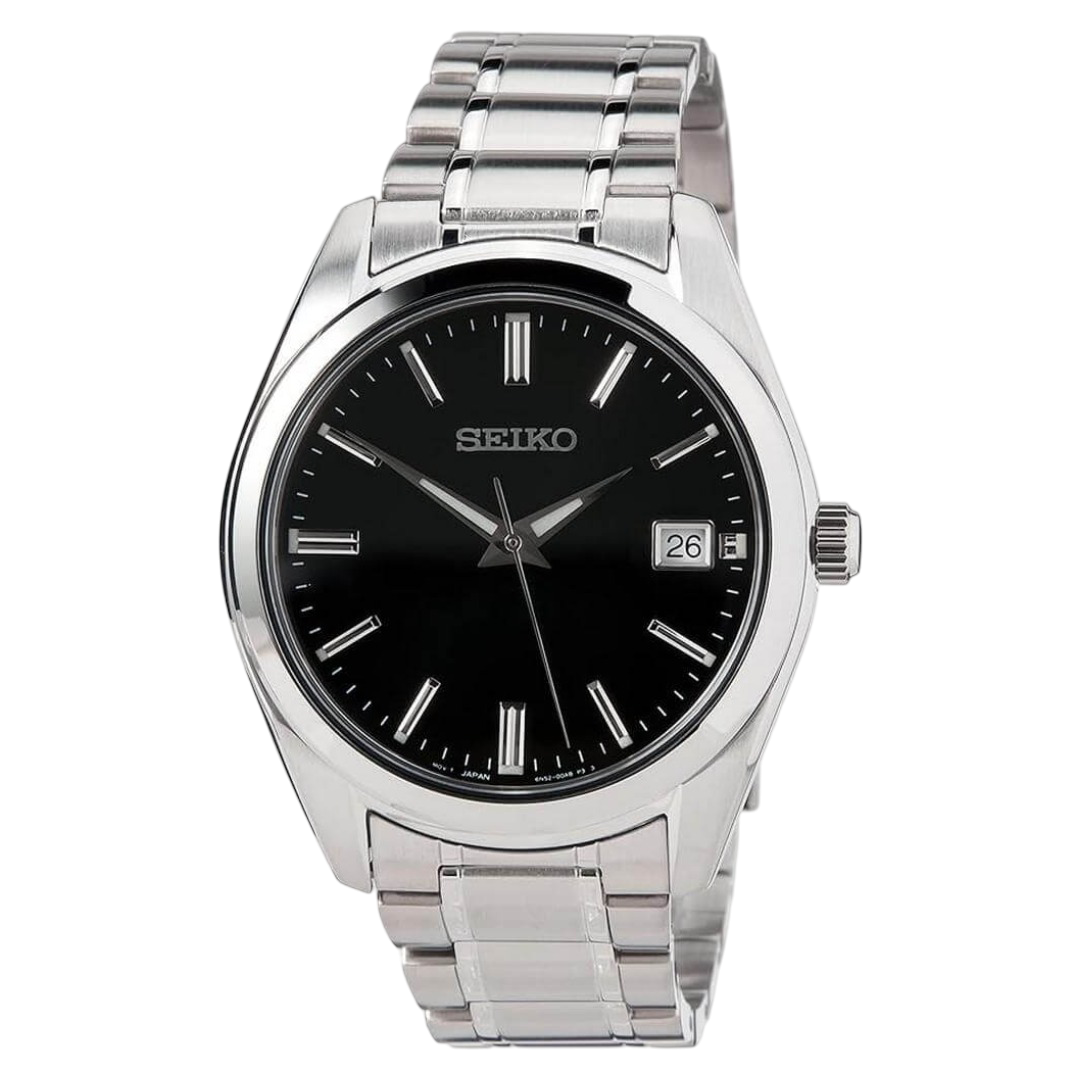 The Seiko Essentials Quartz Watch – Model SUR311P1 combines classic design with reliable functionality. It features a 40.2mm stainless steel case, a black dial with luminous hands and indexes, and a date display. Powered by Seiko’s precise quartz movement, this timepiece is complemented by a stainless steel bracelet, making it suitable for both formal and casual wear.