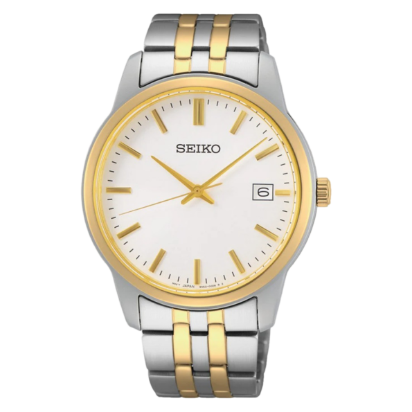 The Seiko Essentials Quartz Watch – Model SUR402P1 combines classic design with reliable functionality. It features a 40mm stainless steel case with a two-tone finish, a white dial with gold-tone hands and markers, and a date display. Powered by Seiko’s precise quartz movement, this timepiece is complemented by a two-tone stainless steel bracelet, making it suitable for both formal and casual wear.