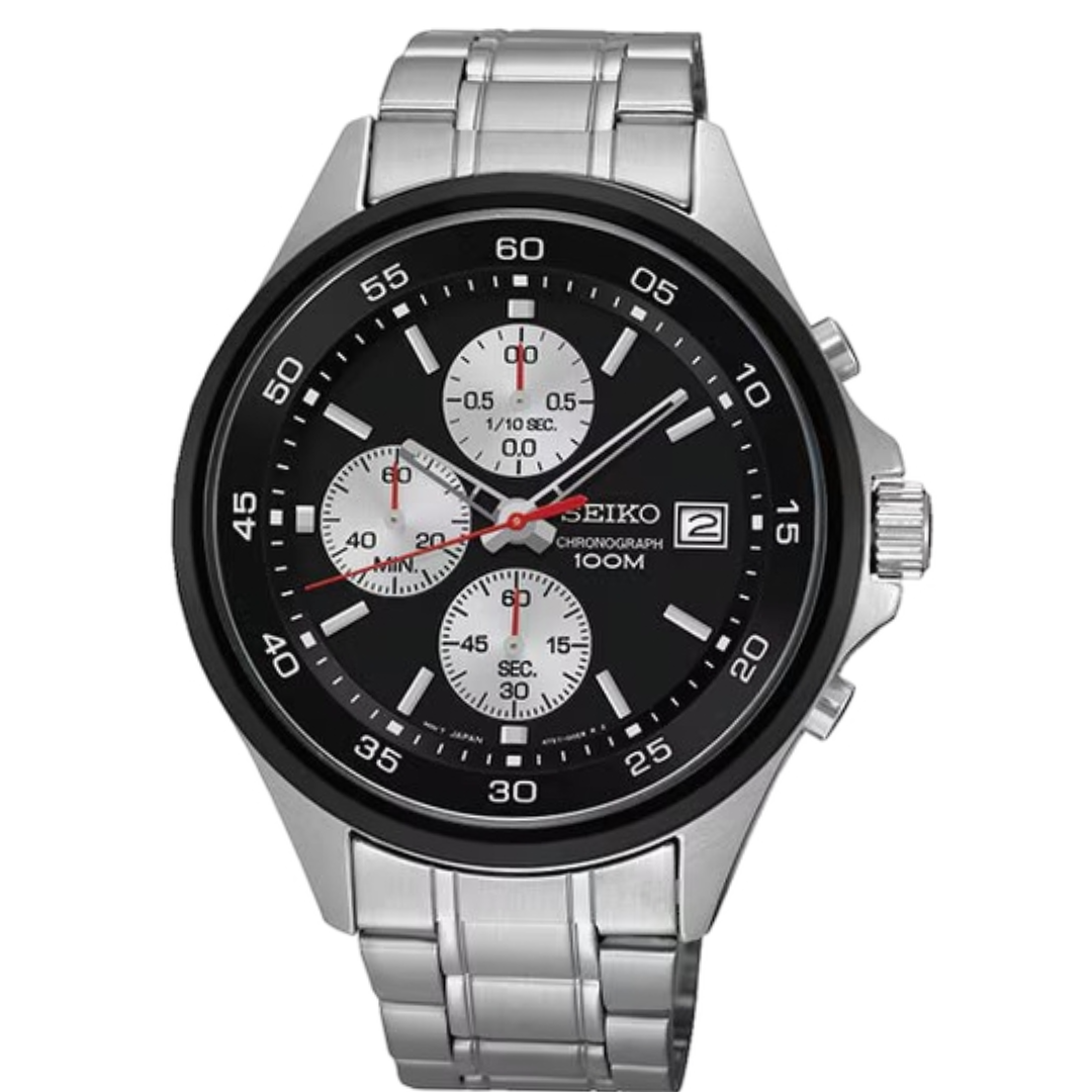 A sharp and versatile chronograph watch with a silver stainless steel body and bold black dial for a refined everyday look.