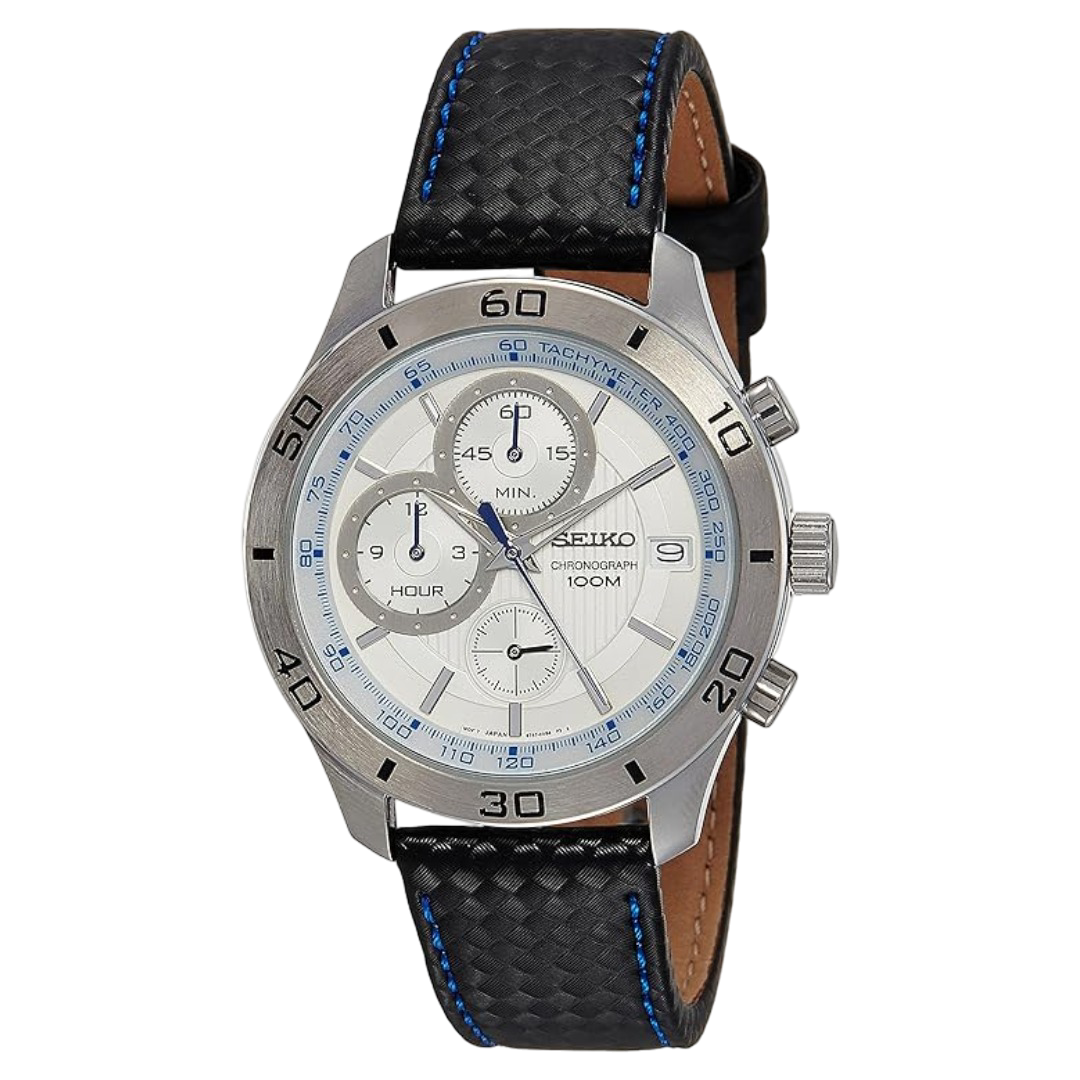The Seiko Quartz Chronograph – Model SSB191P1 combines classic design with modern features. The 42mm stainless steel case encases a clean white dial, adorned with luminous silver-tone hands and index hour markers for enhanced readability. The chronograph function, with separate sub-dials for seconds, minutes, and hours, allows for precise time measurement. A date display at the 3 o’clock position adds convenience to the wearer. Powered by a reliable quartz movement, the watch ensures accurate timekeeping. The black leather strap provides a comfortable and secure fit, suitable for daily wear. With a water resistance of up to 10 ATM (100 meters), it is suitable for swimming and snorkeling. This timepiece is an excellent choice for those seeking a combination of style, functionality, and durability.