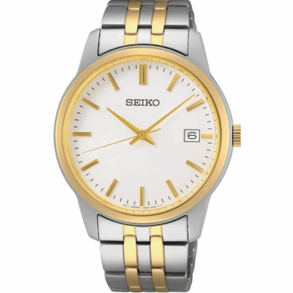 The Seiko SUR402P1 is a refined timepiece from Seiko’s Essentials Collection, designed for men who appreciate understated style and reliable performance. Its 40mm stainless steel case houses a white dial with gold-tone hands and index markers, ensuring readability in various lighting conditions. The watch features a date display at the 3 o’clock position and is powered by the precise Seiko Caliber 6N52 quartz movement, offering an accuracy of ±15 seconds per month and a battery life of approximately 3 years. The two-tone stainless steel bracelet provides durability and comfort, while the scratch-resistant Hardlex crystal protects the dial. With a water resistance of up to 50 meters, the SUR402P1 is suitable for everyday wear and can withstand splashes and brief immersion in water.