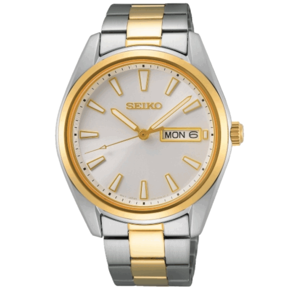 The Seiko SUR446P1 is a sophisticated timepiece designed with a versatile two-tone stainless steel finish that suits any occasion. Its white dial offers a clean and refined appearance, enhanced by gold-tone hour markers and hands for a touch of luxury. Powered by a reliable quartz movement, this watch delivers accurate timekeeping with minimal maintenance. The design is completed with a practical date display at 3 o’clock and a scratch-resistant hardlex crystal. Water resistance up to 100 meters makes it a dependable companion for daily wear.