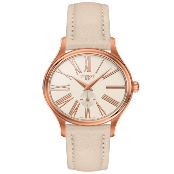 The Tissot Bella Ora is a refined women’s dress watch featuring a 31.4mm rose gold-tone stainless steel case, an ivory dial, and a cream leather strap. Its minimalist design and quality materials make it a versatile accessory suitable for various occasions.