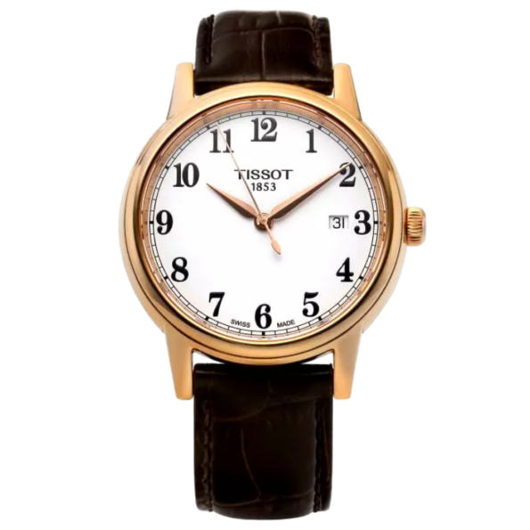 The Tissot Carson 40mm is a classic and elegant timepiece featuring a 40mm rose gold PVD-coated stainless steel case, a white dial with rose gold-tone Arabic numerals and hands, and a brown leather strap. Powered by a Swiss quartz movement, it offers precise timekeeping and is protected by a scratch-resistant sapphire crystal. The watch is water-resistant up to 30 meters.
