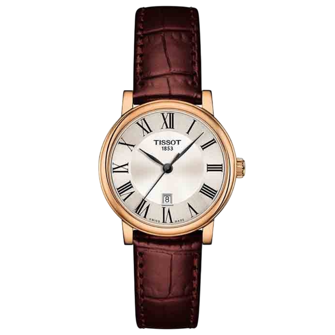 The Tissot Carson Premium Lady is an elegant women’s dress watch featuring a 30mm rose gold PVD-coated stainless steel case, a silver dial with Roman numeral markers, and a brown leather strap. Its classic design and quality materials make it a versatile accessory suitable for various occasions.