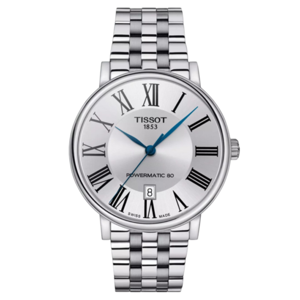The Tissot Carson Premium Powermatic 80 (Model T122.407.11.033.00) embodies timeless elegance with modern watchmaking technology. The 40mm case is crafted from 316L stainless steel, providing durability and a polished appearance. The silver dial is adorned with Roman numeral hour markers and slender blue hands, offering a sophisticated and easy-to-read display.