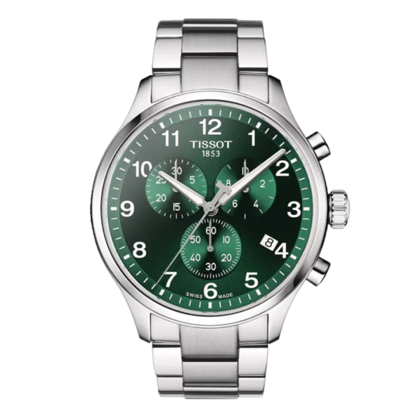 The Tissot Chrono XL Classic is a stylish and functional timepiece featuring a 45mm stainless steel case, green dial with Arabic numerals, and a scratch-resistant sapphire crystal. This watch offers precise chronograph functions and a date display, combining sporty design with Swiss technology at an attractive price point.