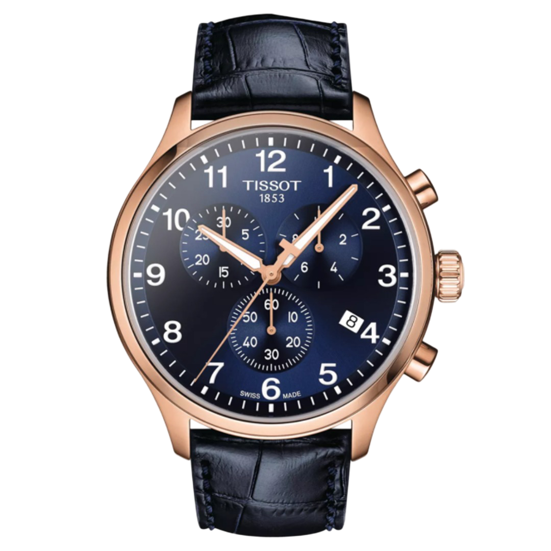The Tissot Chrono XL Classic is a sophisticated chronograph featuring a 45mm stainless steel case with rose gold PVD coating, a deep blue dial with Arabic numerals, and a scratch-resistant sapphire crystal. This watch combines Swiss precision with a stylish design, offering chronograph functions and a date display.
