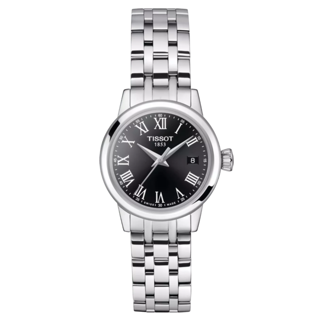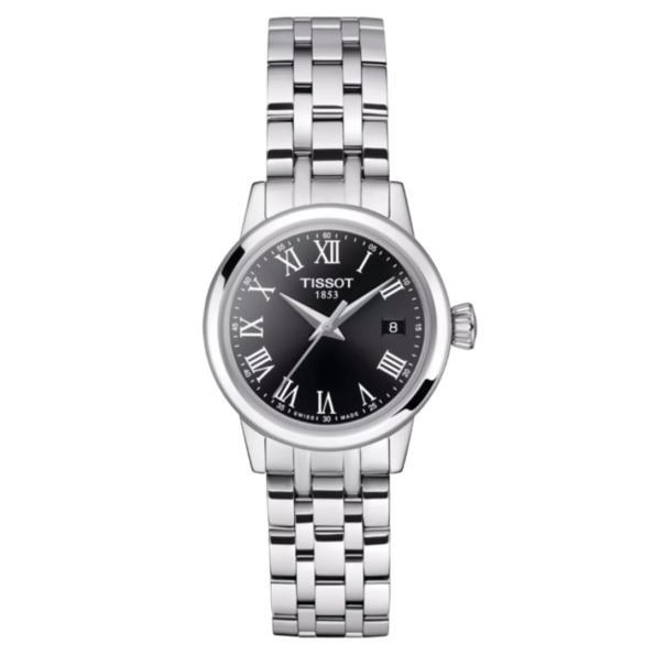 The Tissot Classic Dream Lady is an elegant women’s dress watch featuring a 28mm stainless steel case, a black dial with Roman numeral markers, and a stainless steel bracelet. Its timeless design and quality materials make it a versatile accessory suitable for both formal and casual occasions.
