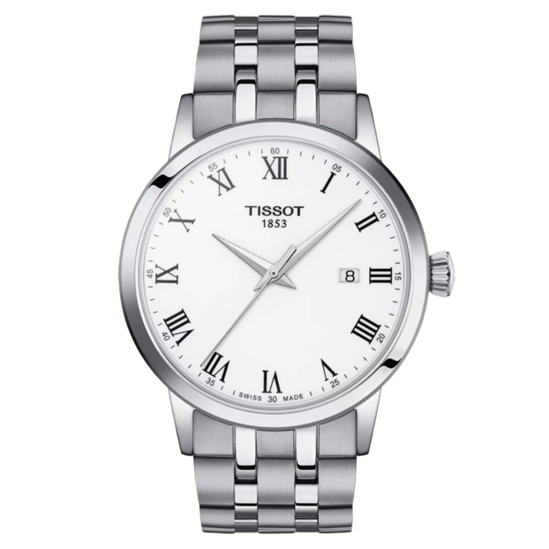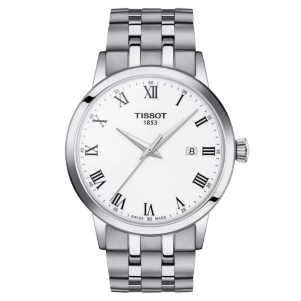 The Tissot Classic Dream is a sophisticated men’s dress watch featuring a 42mm stainless steel case, white dial with Roman numeral hour markers, and a scratch-resistant sapphire crystal. Its timeless design and reliable Swiss quartz movement make it an ideal accessory for both formal and casual occasions.