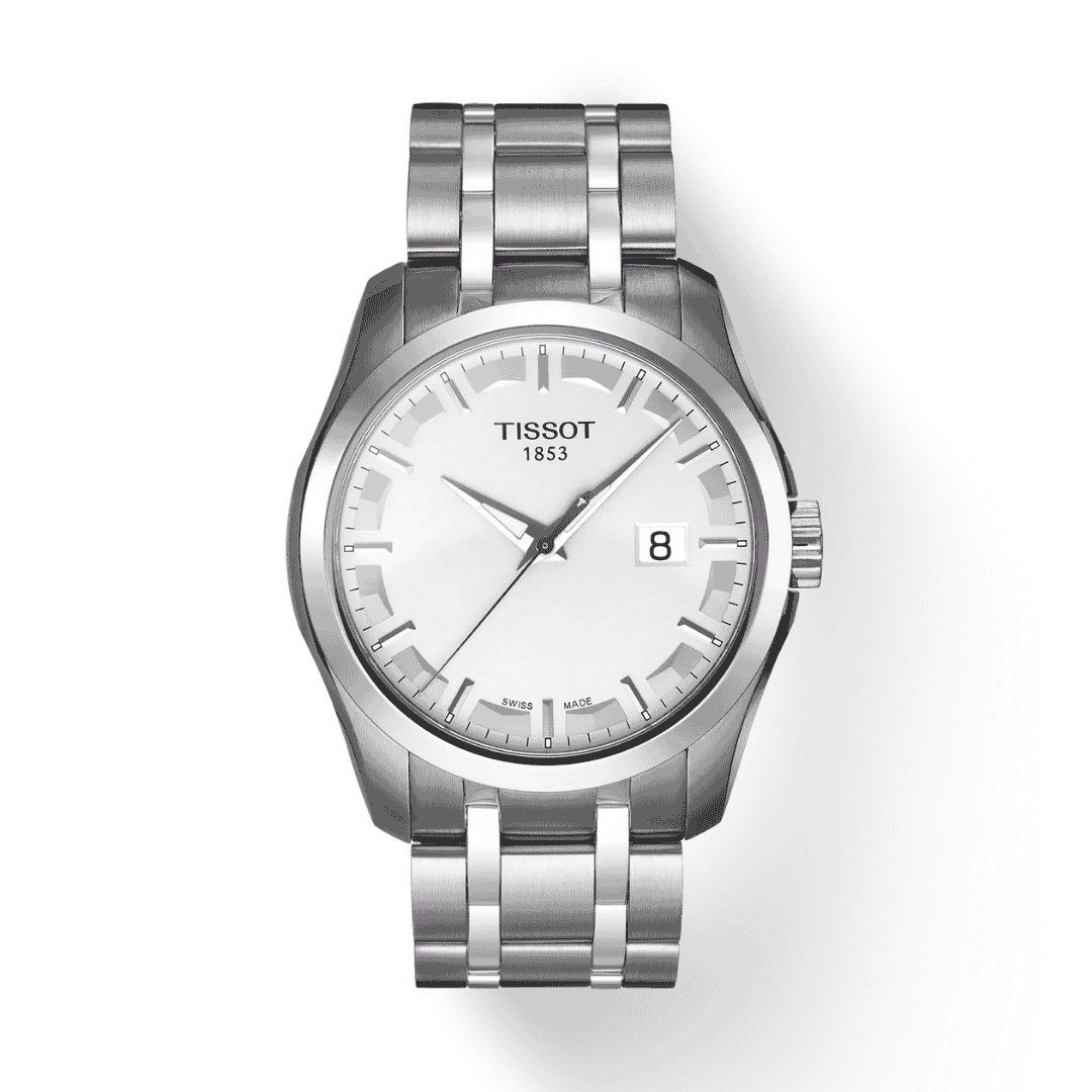 The Tissot Couturier is an elegant men’s dress watch featuring a 39mm stainless steel case, silver dial with index hour markers, and a scratch-resistant sapphire crystal. Its timeless design and reliable Swiss quartz movement make it suitable for both formal and casual occasions.
