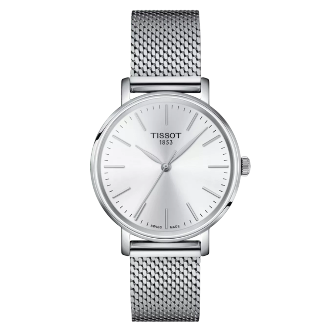 The Tissot Everytime 34mm is a sleek and modern timepiece featuring a 34mm stainless steel case, a white dial with minimalist index markers, and a stainless steel mesh bracelet. Its understated design and quality materials make it a versatile accessory suitable for both casual and formal occasions.