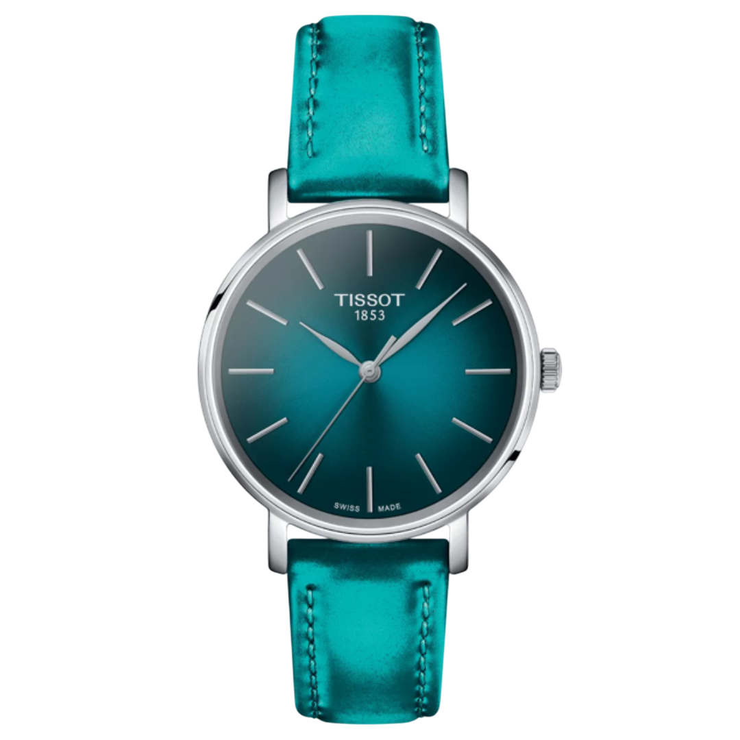 The Tissot Everytime 34mm is a sleek and modern timepiece featuring a 34mm stainless steel case, a gradient turquoise-to-black dial with minimalist index markers, and a turquoise leather strap. Its contemporary design and quality materials make it a versatile accessory suitable for both casual and formal occasions.