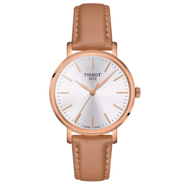 The Tissot Everytime 34mm is a refined timepiece featuring a 34mm stainless steel case with rose gold PVD coating, a white dial with minimalist index markers, and a beige leather strap. Its elegant design and quality materials make it a versatile accessory suitable for both casual and formal occasions.