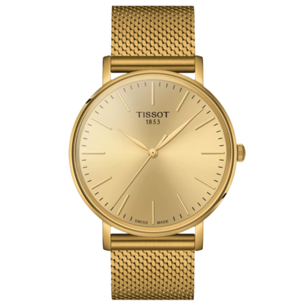The Tissot Everytime 40mm is a sophisticated and minimalist timepiece designed for the modern gentleman. Featuring a 40mm 316L stainless steel case with yellow gold PVD coating, a champagne dial with gold-tone hands and index hour markers, and a matching yellow gold PVD-coated stainless steel bracelet, this watch exudes elegance. Its scratch-resistant sapphire crystal and 50-meter water resistance ensure durability for daily wear.