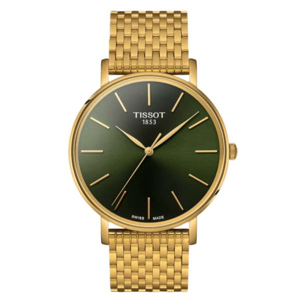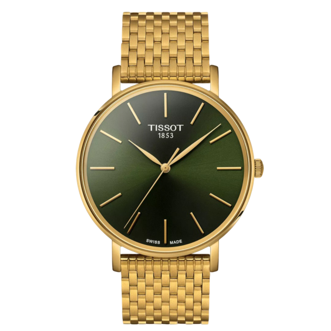 The Tissot Everytime 40mm is a sophisticated and minimalist timepiece designed for the modern gentleman. Featuring a 40mm 316L stainless steel case with yellow gold PVD coating, a green dial with gold-tone hands and index hour markers, and a matching yellow gold PVD-coated stainless steel bracelet, this watch exudes elegance. Its scratch-resistant sapphire crystal and 50-meter water resistance ensure durability for daily wear.
