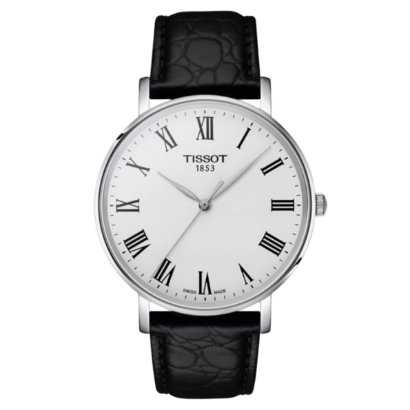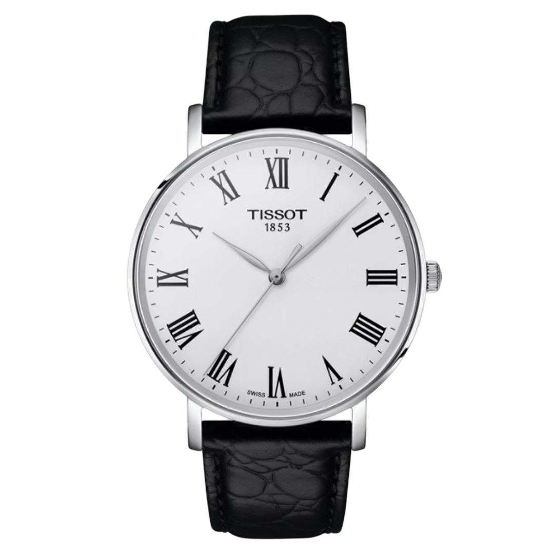 The Tissot Everytime 40mm is a sleek and minimalist timepiece featuring a 40mm stainless steel case, a silver dial with black Roman numeral hour markers, and a black leather strap. Powered by a Swiss quartz movement, it offers precise timekeeping and is protected by a scratch-resistant sapphire crystal. The watch is water-resistant up to 50 meters.
