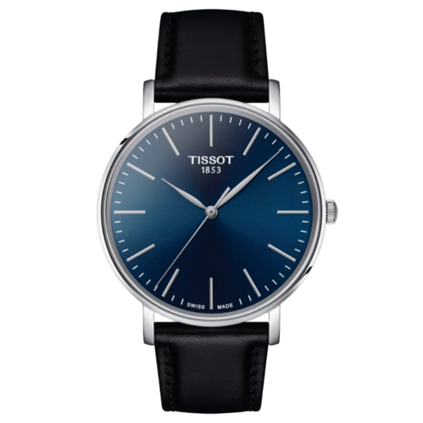 The Tissot Everytime 40mm is a timeless and elegant timepiece featuring a 40mm stainless steel case, a striking blue dial, and a black leather strap. Powered by a Swiss quartz movement, it offers precise timekeeping and is protected by a scratch-resistant sapphire crystal. The watch is water-resistant up to 50 meters.