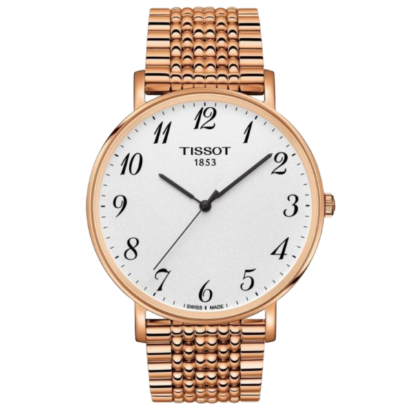 The Tissot Everytime Large (Model T109.610.33.032.00) embodies timeless elegance with modern simplicity. The 42mm case is crafted from 316L stainless steel with a rose gold PVD coating, offering durability and a refined appearance. The silver dial is complemented by black hands and index hour markers, providing a clean and contemporary look. Powered by a Swiss quartz movement (Caliber ETA 902.101), this watch ensures precise timekeeping. The scratch-resistant sapphire crystal protects the dial, maintaining clarity over time. The rose gold PVD-coated stainless steel bracelet is secured with a deployment clasp, ensuring a comfortable and secure fit. With a water resistance of up to 30 meters (3 bar), this watch can withstand splashes and brief immersion in water but is not suitable for swimming or bathing.
