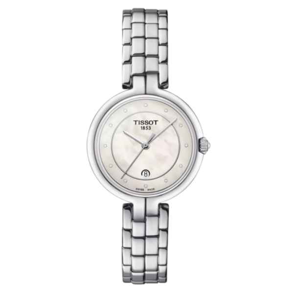 The Tissot Flamingo – Model T094.210.11.116.01 exemplifies Tissot’s commitment to precision and timeless design. The 30mm 316L stainless steel case offers durability and a polished appearance suitable for various occasions. Its white mother-of-pearl dial, complemented by silver-tone hands and 12 diamond indices, ensures clear readability and adds a touch of luxury. A date window is conveniently positioned at the 6 o’clock mark.