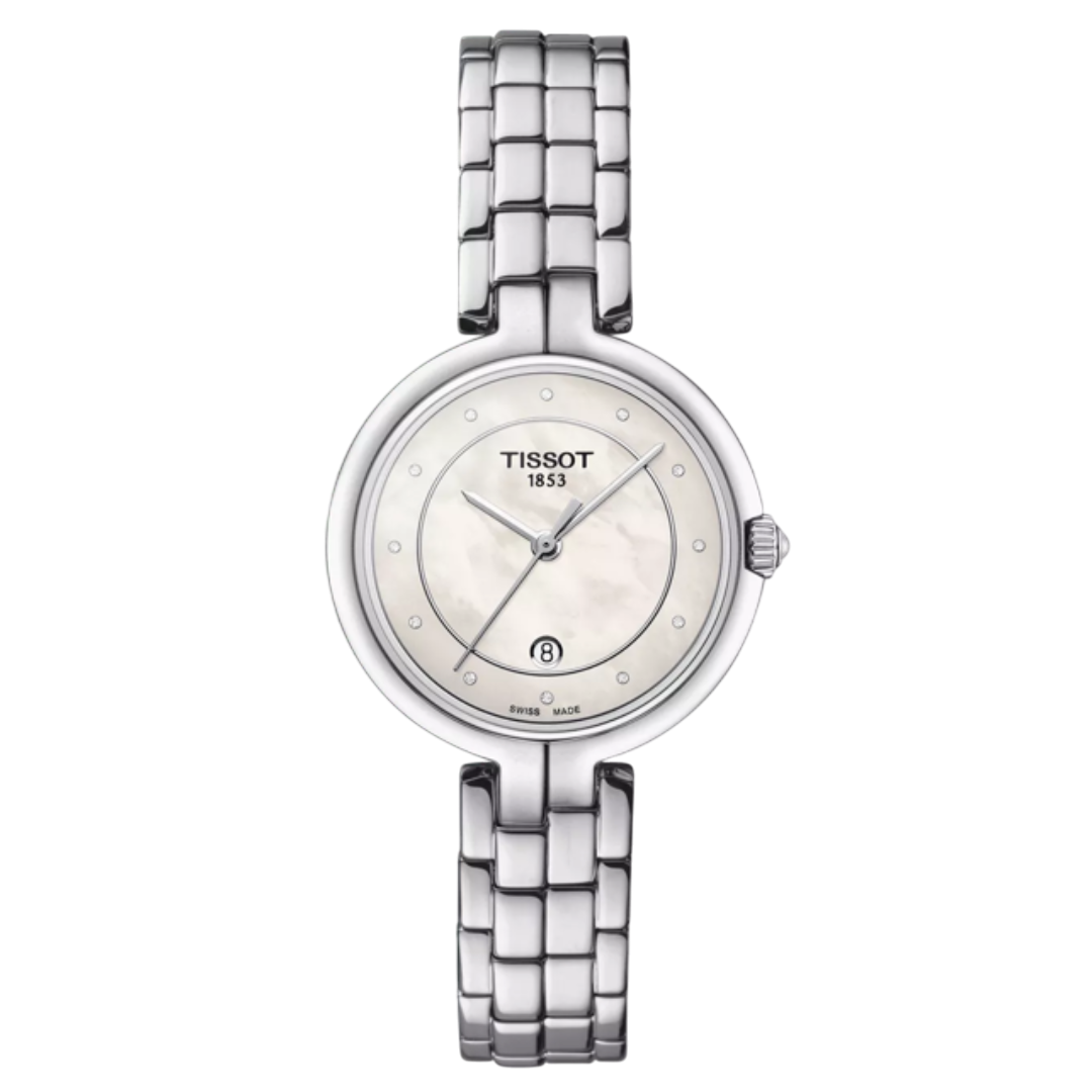 The Tissot Flamingo is an elegant women’s timepiece that combines subtlety with sophistication. Featuring a 30mm stainless steel case, a white mother-of-pearl dial adorned with diamond indices, and a stainless steel bracelet, this watch is powered by a Swiss quartz movement and is water-resistant up to 50 meters.