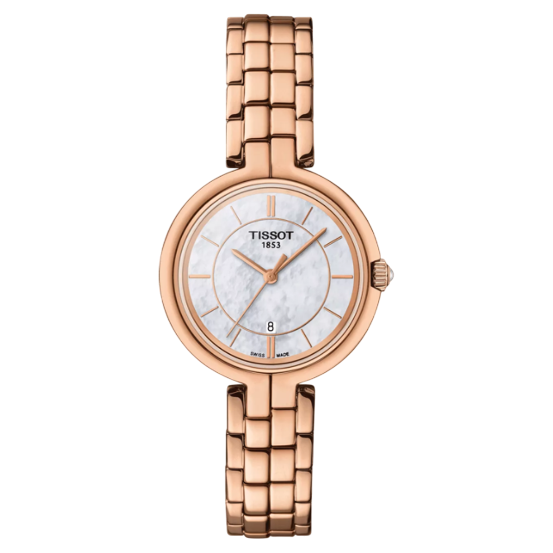 The Tissot Flamingo is an elegant women’s timepiece that combines contemporary jewelry aesthetics with Swiss precision. Featuring a 30mm stainless steel case with rose gold PVD coating, a white mother-of-pearl dial, and a matching rose gold PVD-coated stainless steel bracelet, this watch is powered by a Swiss quartz movement and is water-resistant up to 50 meters.