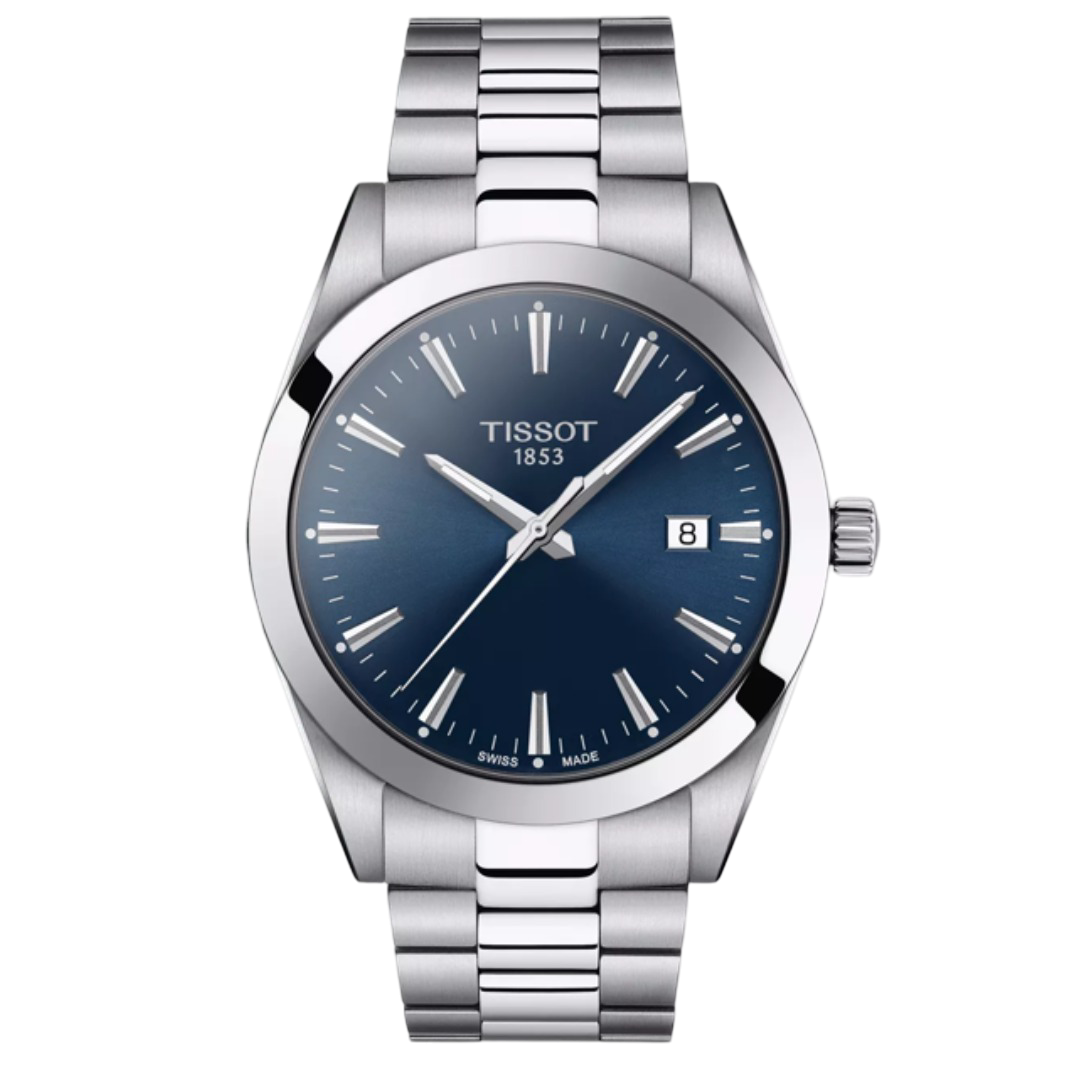 The Tissot Gentleman is a versatile and elegant timepiece designed for the modern man. Featuring a 40mm stainless steel case, a blue sunray dial with luminescent hands and index hour markers, and a date display at the 3 o’clock position, this watch is complemented by a stainless steel bracelet. Its domed scratch-resistant sapphire crystal and 100-meter water resistance ensure durability for everyday wear.