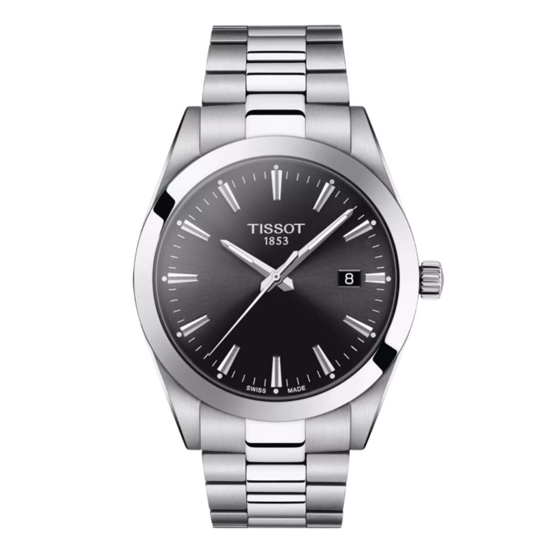 The Tissot Gentleman is a sophisticated timepiece featuring a 40mm stainless steel case, a black dial with silver-tone index hour markers, and a stainless steel bracelet. Its classic design and reliable Swiss quartz movement make it an ideal accessory for both professional and casual settings.