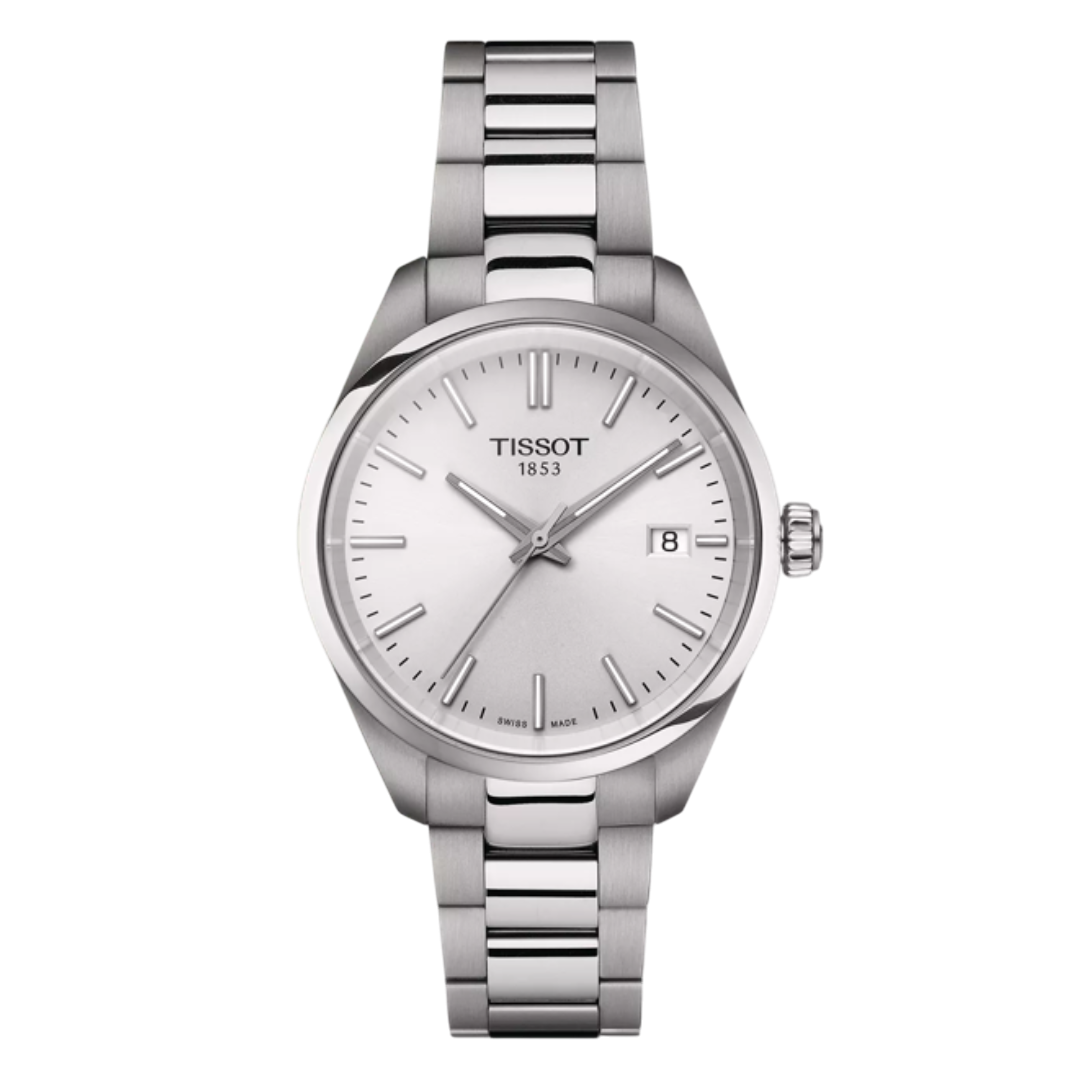 The Tissot PR 100 34mm is a timeless timepiece featuring a 34mm stainless steel case, a silver dial with index hour markers, and a stainless steel bracelet. Its classic design and robust construction make it suitable for both casual and formal occasions.