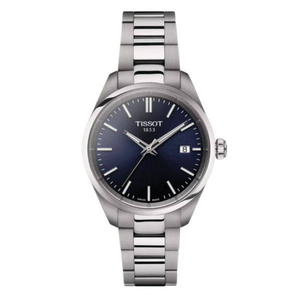 The Tissot PR 100 34mm is a classic and robust timepiece featuring a 34mm stainless steel case, a navy blue dial with luminous hands and index hour markers, and a stainless steel bracelet. Its timeless design and durable construction make it suitable for both casual and formal occasions.