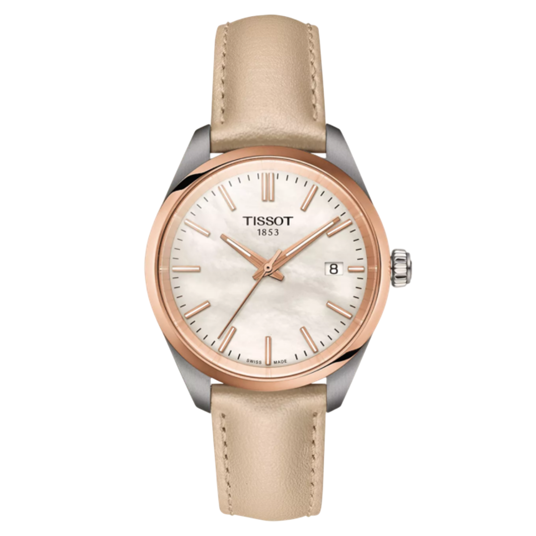 The Tissot PR 100 34mm is an elegant timepiece featuring a 34mm stainless steel case with rose gold PVD coating, a white mother-of-pearl dial with rose gold-tone index hour markers, and a cream leather strap. Its classic design and quality materials make it suitable for both casual and formal occasions.